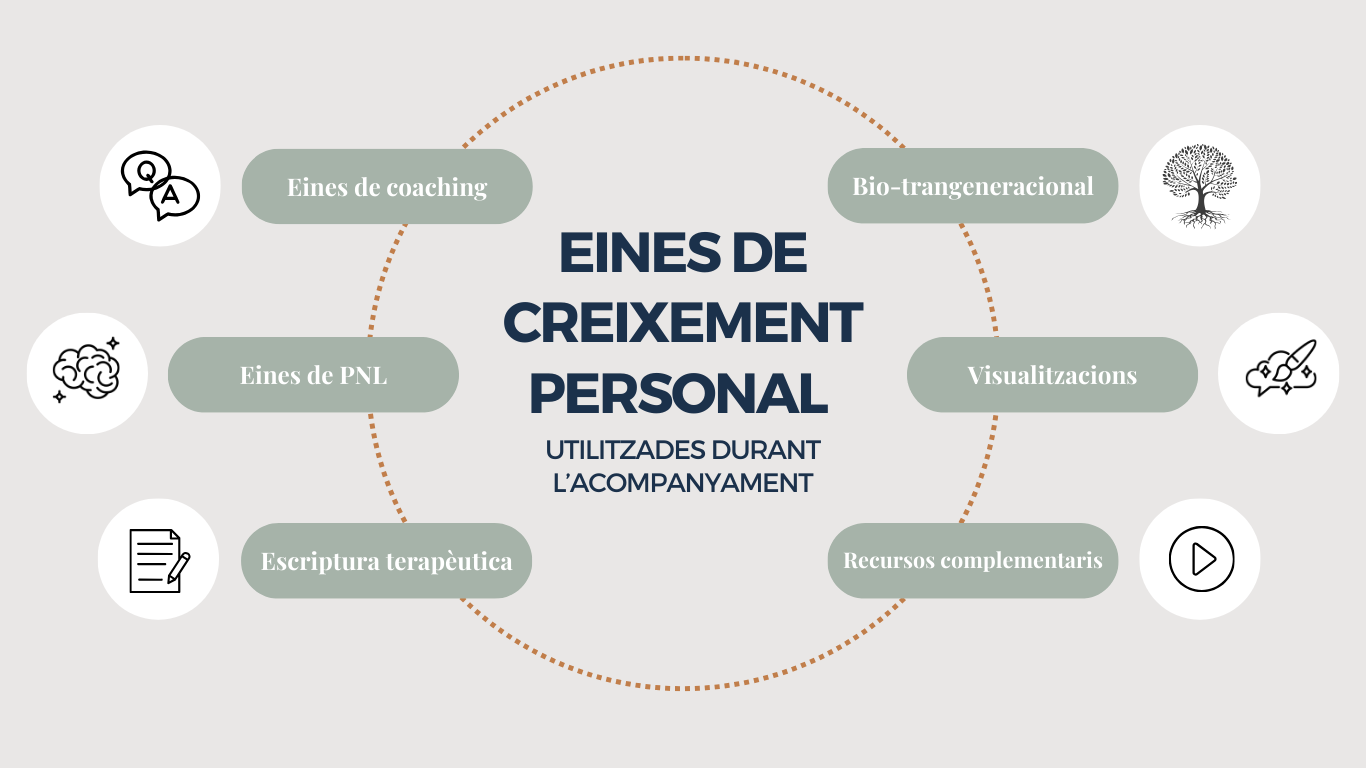 El mètode que he creat per acompanyar-te combina diferents eines de creixement personal: eines de coaching, Programació Neuro Linguistica, sistèmica, transgeneracional, meditacions, visualitzacions i eines gestalt.
